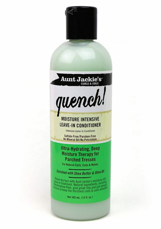 Ahhhh! That’s the sound of your hair exhaling after it drinks in Aunt Jackie’s Quench! Leave-In Conditioner. Long-lasting moisture, slip and softness are delivered through natural conditioners, including Marshmallow Root, Shea Butter and Extra Virgin Olive Oil.