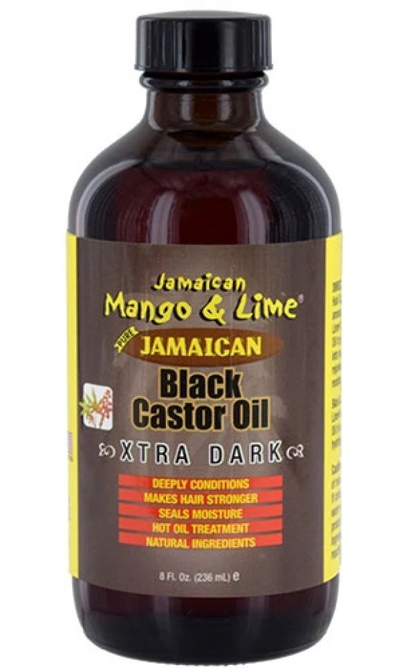 dark brown bottle with black lid; Jamican mango and lime jamaican black castor oil xtra dark 8oz