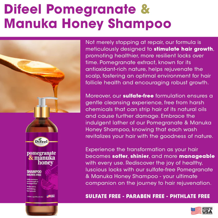 Introducing Difeel Pomegranate & Manuka Honey Shampoo, a luxurious formula meticulously crafted to restore vibrancy to your hair. Enriched with the natural goodness of pomegranate extract and pure manuka honey, our sulfate-free shampoo offers a harmonious blend designed to address multiple hair concerns.