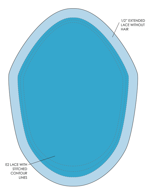 Base Dimension:8" x 10.5"Cap Design:1/2" extended E2 lace without hair, E2 lace base with stitched contour lines